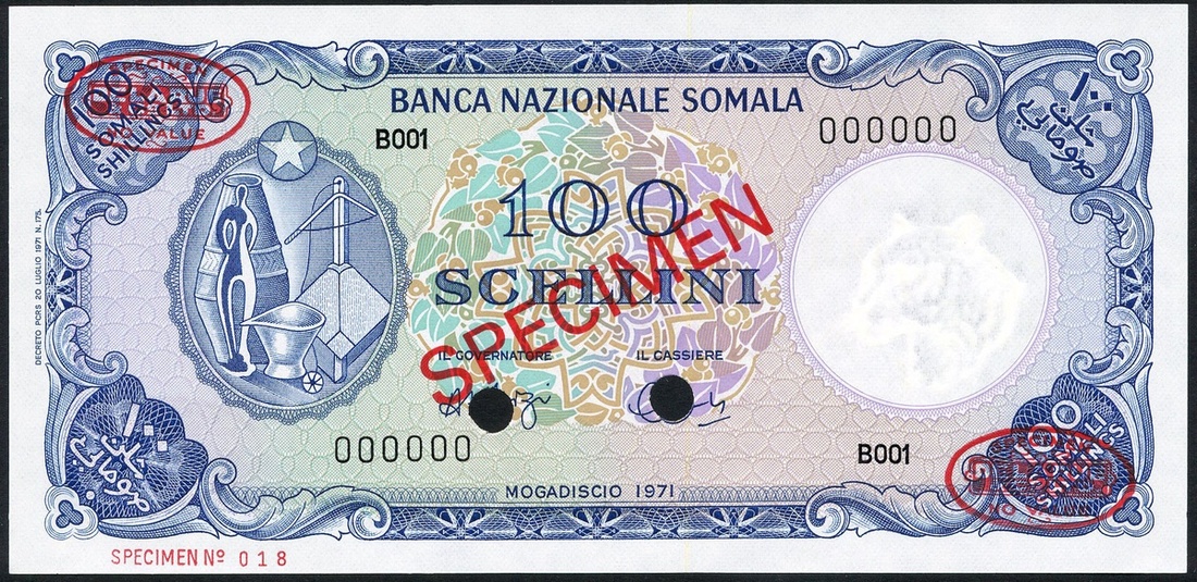 Banca Nazionale Somala, 100 Scellini, 1971, zero serial number, (Pick 16s, TBB B109cs), uncirculated, perforated and with De La Rue specimen chop marks