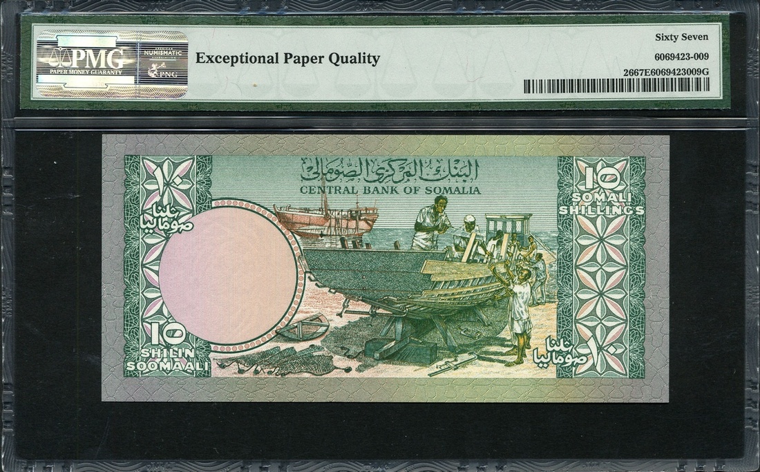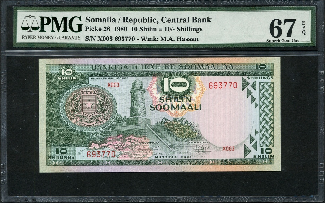 Central Bank of Somalia, 10 shillings, 1980, red serial number X003 693770, (TBB B303b, Pick 26), in PMG holder 67 EPQ superb gem unc, highest grade in Track and Price at the time of cataloguing, next grade is 60, scarce in such high grade