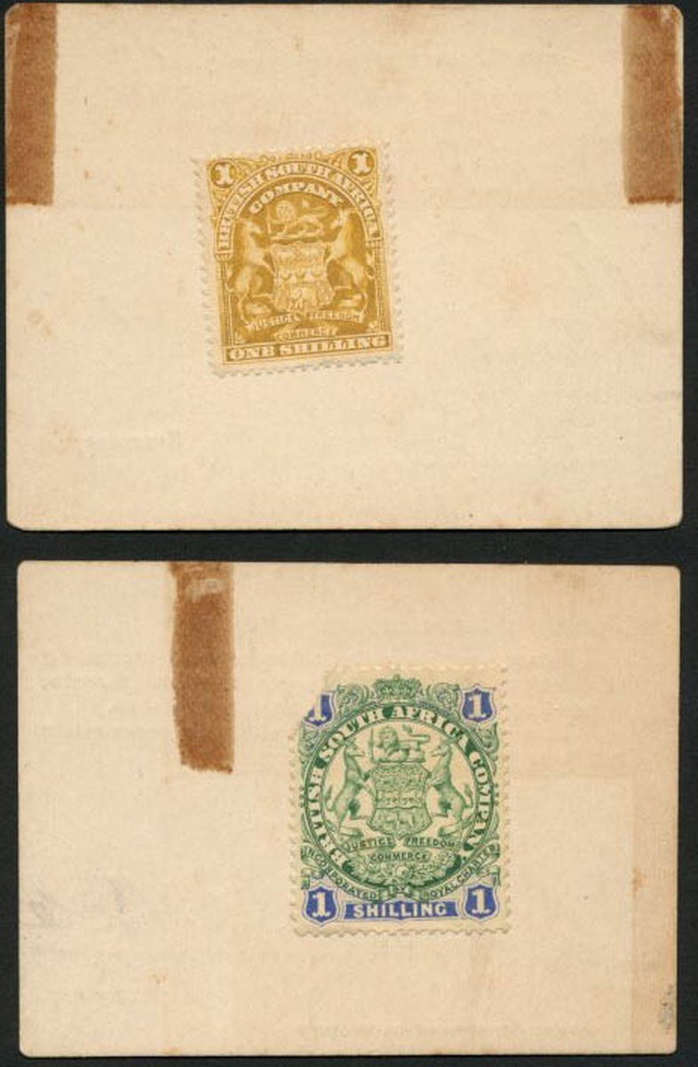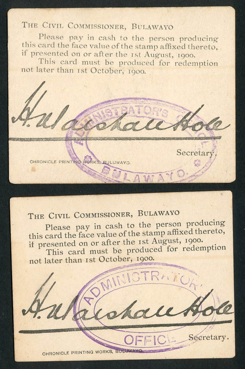 Boer War, Marshall Hole Currency Card, 1/- (2), ND (1 August 1900), the first pale yellow and the second green and blue (Pick S665), mounted on original cards, pale yellow 1/- complete and remaining stamp torn at top left corner, the pale yellow 1/- hand stamped Administrator's Office Bulawayo, the other Administrator's Office