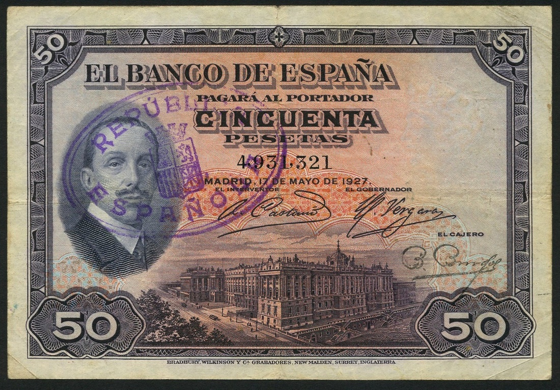 El Banco de Espana, 50 pesetas, 17 May 1927 (1931), serial number 4931321, purple on multicolour underprint, King Alfonso XIII at left, Royal palace in Madrid at low centre, purple Republic Validation at upper left corner