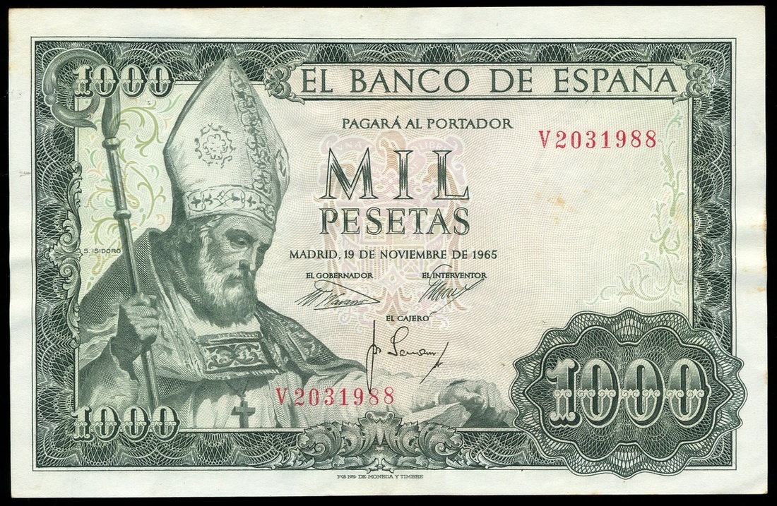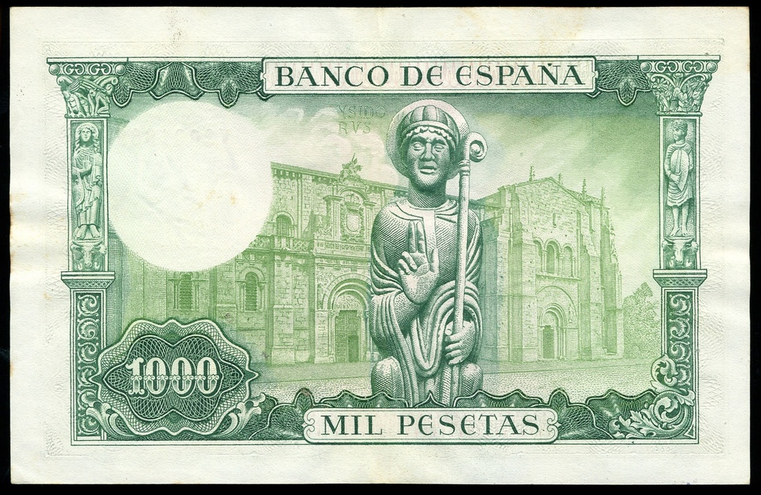 (x) Banco de Espana, 1000 pesetas, 19 November 1965, serial number V2031988, green, San Isidoro at left, reverse, figure with basilica