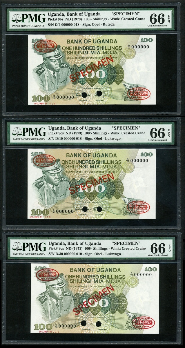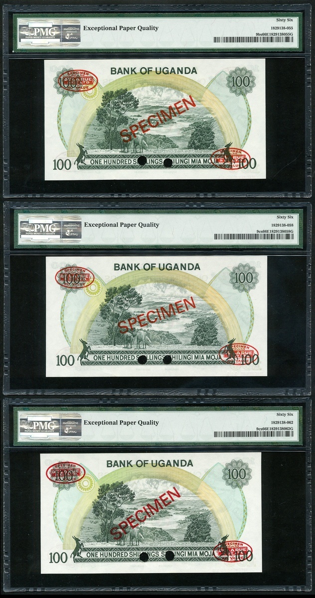 Bank of Uganda, a group of 3x specimen 100 Shillings, ND (1973), zero serial number, (Pick 9bs, 9cs, TBB B109as2), all in PMG holder 66 EPQ Gem Uncirculated (3)