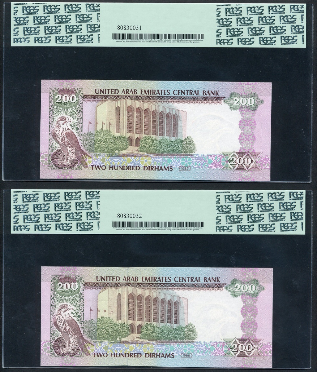 United Arab Emirates Currency Board, 200 dirhams (2), 1989, (Pick 16a, TBB B211a), in PCGS Currency holders 65PPQ and 66PPQ Gem New (2)
