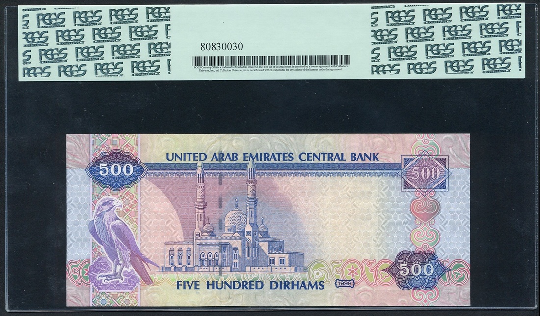 United Arab Emirates Currency Board, 500 dirhams, 1998, serial number 052999952, (Pick 24a, TBB B219a), in PCGS Currency holder 64PPQ Very Choice New