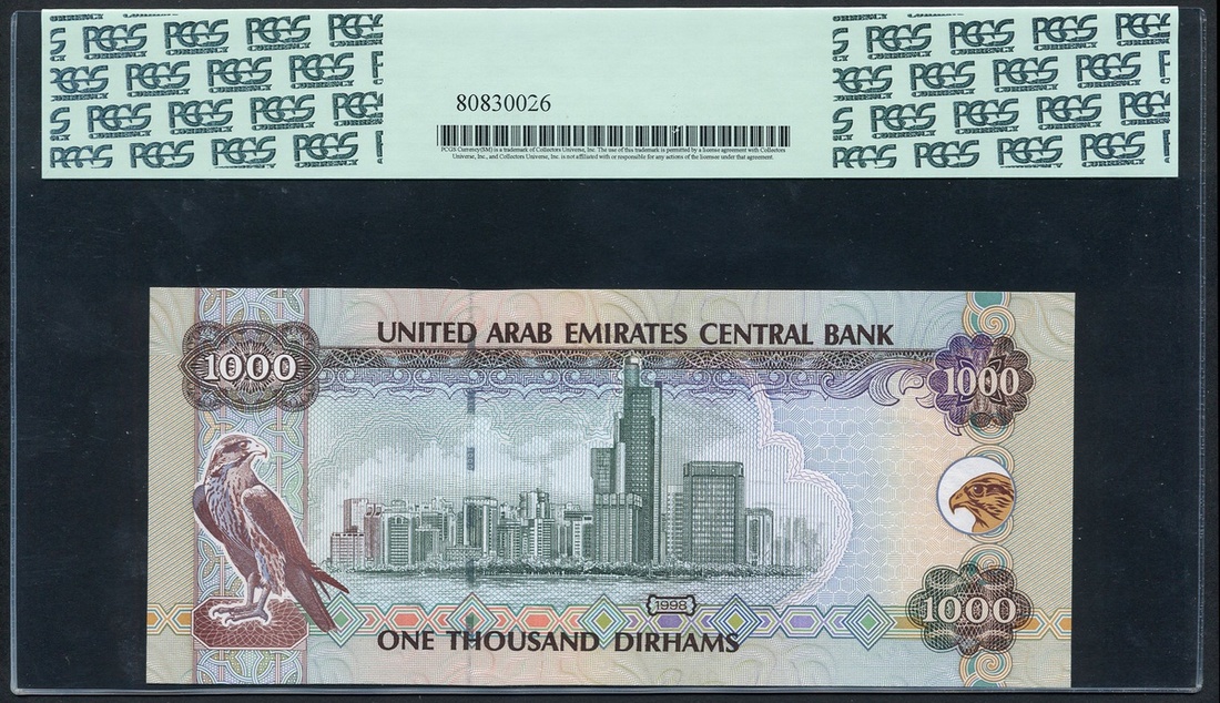 United Arab Emirates Currency Board, 1000 dirhams, 1998, serial number 021102854, (Pick 25a, TBB B220a), in PCGS Currency holder 65PPQ Gem New