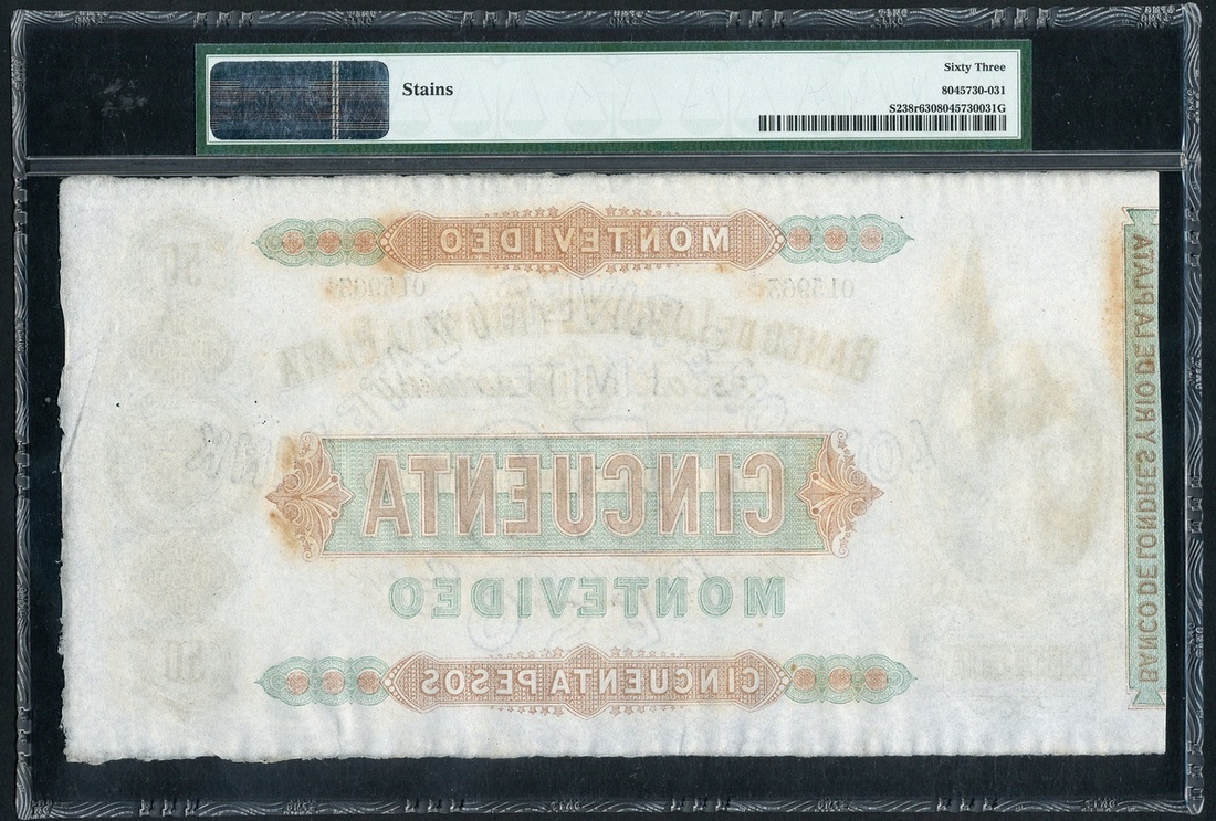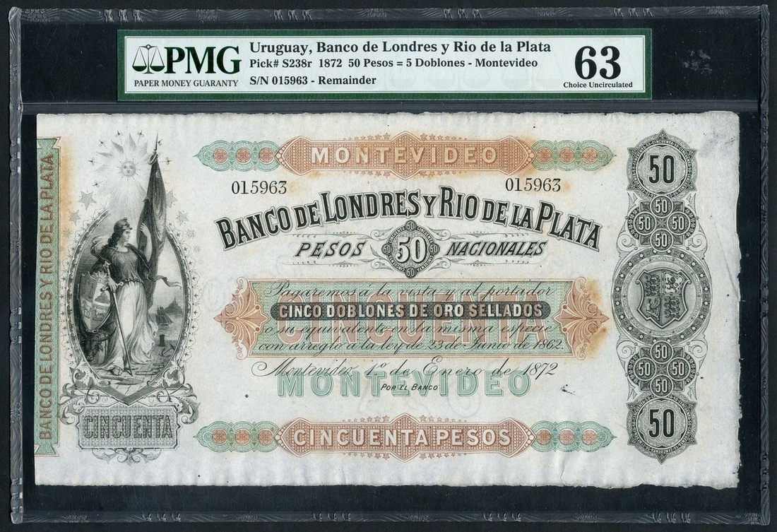 (x) Uruguay, Banco De Londres Y Rio De La Plata, remainder 50 Pesos, Montevideo, 1 January 1872, serial number 015963, (Pick S238r), in PMG holder 63 Choice Uncirculated (Stains)