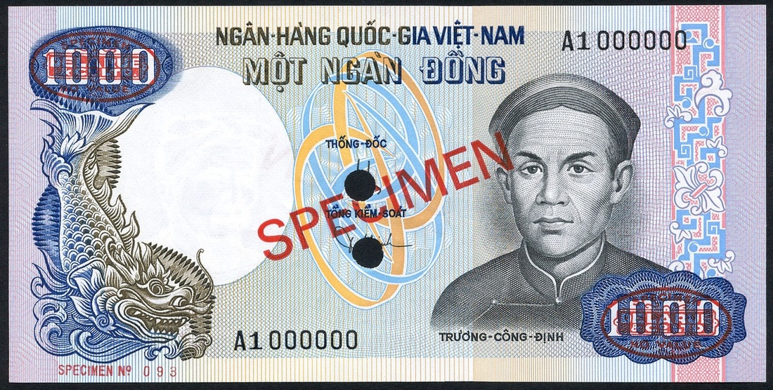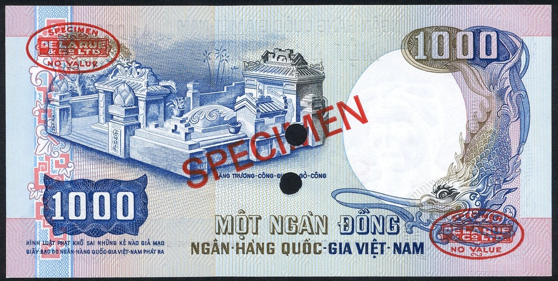 National Bank of Vietnam, South Vietnam, 1000 Dong, ND (1975), zero serial number, (Pick 34As, TBB B139s), uncirculated, perforated and with De La Rue specimen chop marks