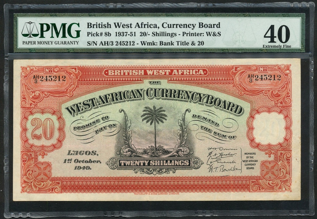 (x) West African Currency Board, 20 shillings, 1 October 1949, serial number AH/3 245212, (Pick 8, TBB B108t), in PMG holder 40 Extremely Fine (Minor Rust)