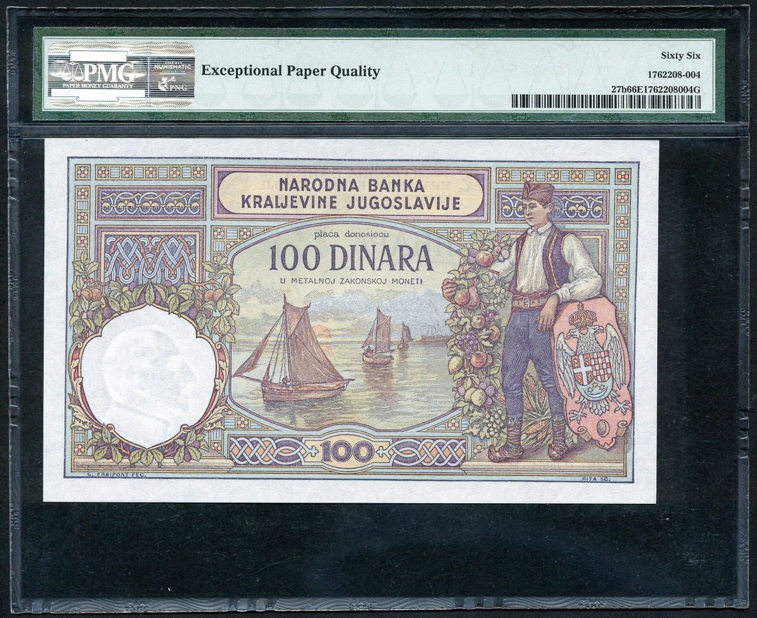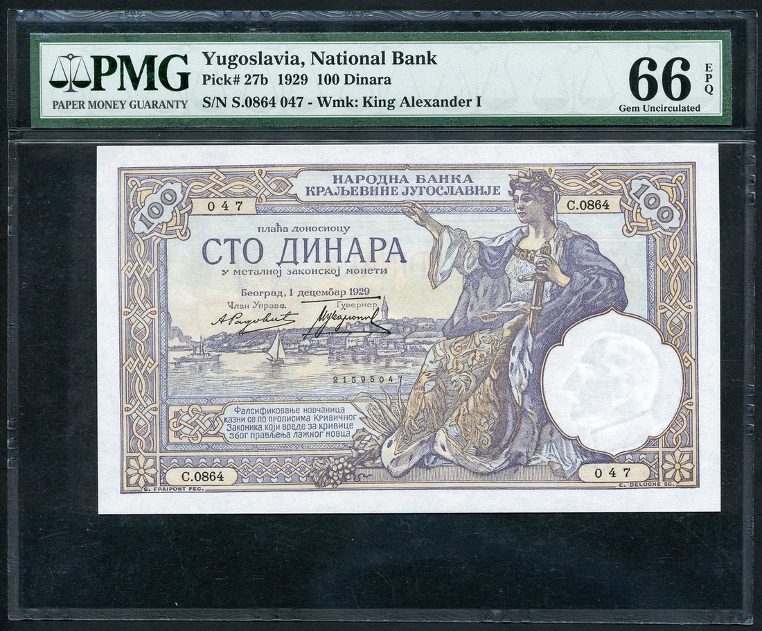 (x) National Bank of Yugoslavia, 100 Dinara, Belgrade, 1 December 1929, serial number S.0864 047, (Pick 27b), in PMG holder 66 EPQ Gem Uncircualted
