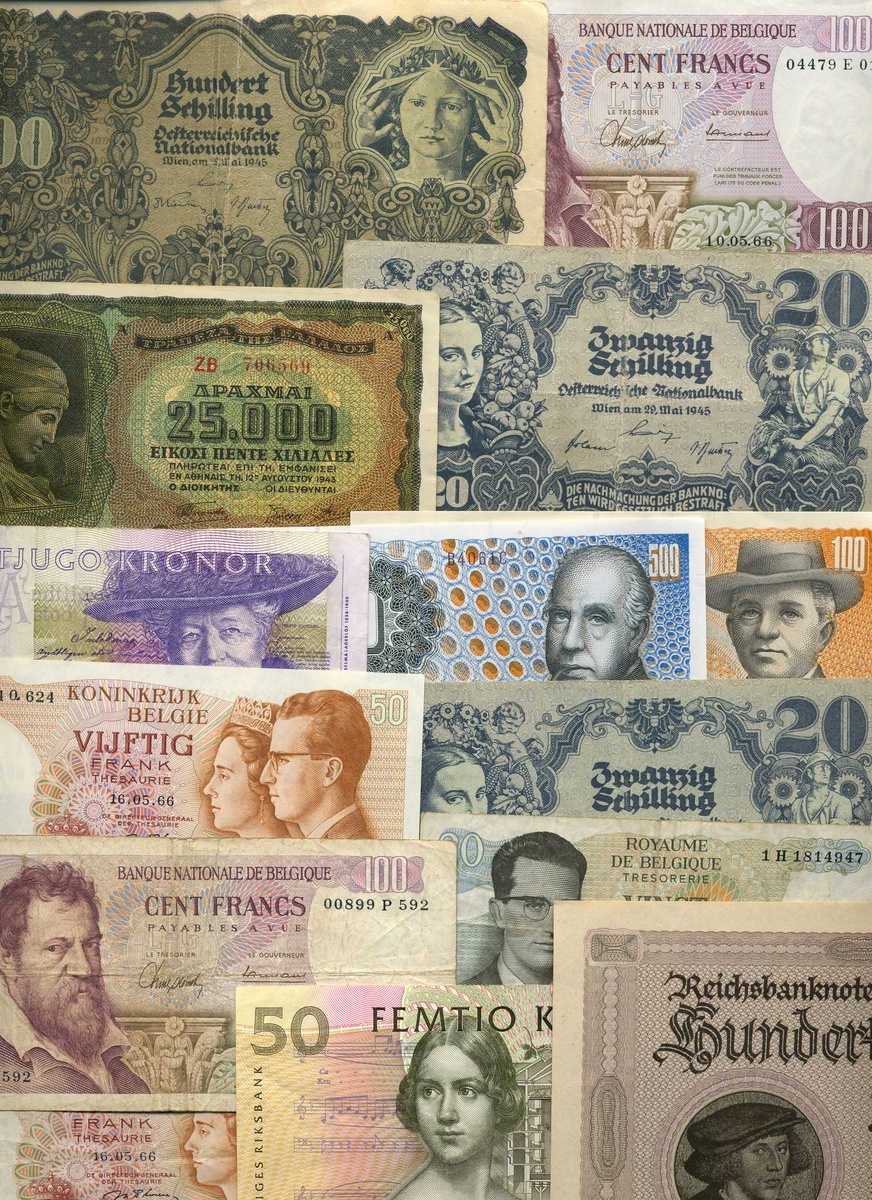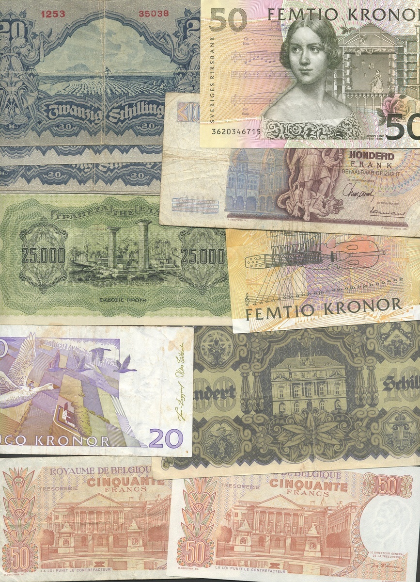 A group of Western European notes including Austria (9), Belgium (6), Denmark, Germany, Greece, Sweden (9), generally very fine to about uncirculated (27)
