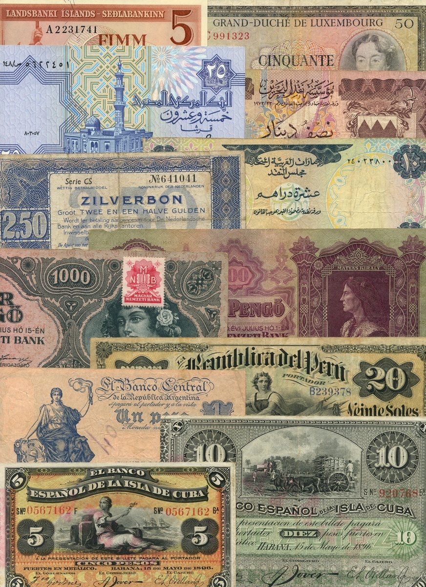 A group of World Banknotes, including Argentina, Bahrain, Belgium, Cuba, Egypt, France, Hungary, Iceland, Luxembourg, Netherlands, Peru, UAE,