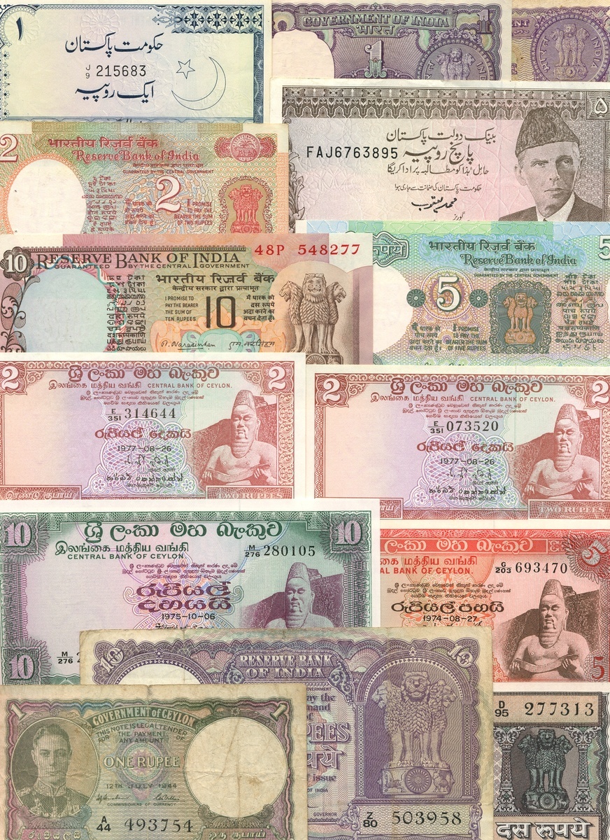 A group of South Asia notes, including Ceylon, India and Pakistan, Ceylon, 1 rupee, 1944, 2 rupees (2), 5 rupees, 10 rupees, 1974-77, India, 1 rupee (2), 1957, 1976, 10 rupees (2), 2 rupees, 5 rupees, 10 rupees, 1976, Pakistan, 1 rupees, 1953-63, 5 rupees, 1981-82,