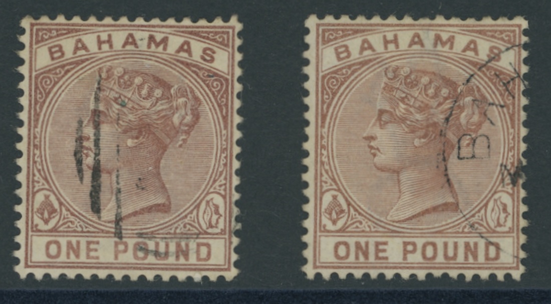 1884-90 £1 Venetian red (2), one cancelled with small part datestamps, the other cancelled part "A05" obliterator; fine. R.P.S. Certificate (1973) for the latter. S.G. 57, £450