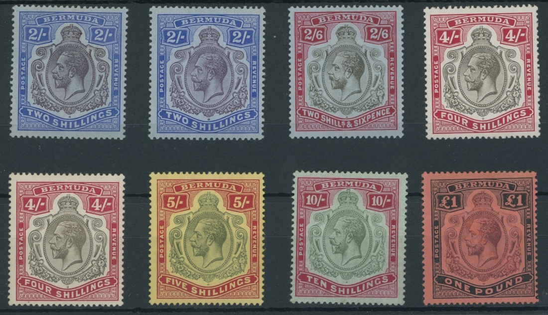 1918-22 MCA 2/- (2 shades), 2/6d., 4/- (2 shades), 5/-, 10/- green and red on pale bluish green and £1 (centred to right), fine mint. S.G. 51b-55, £877