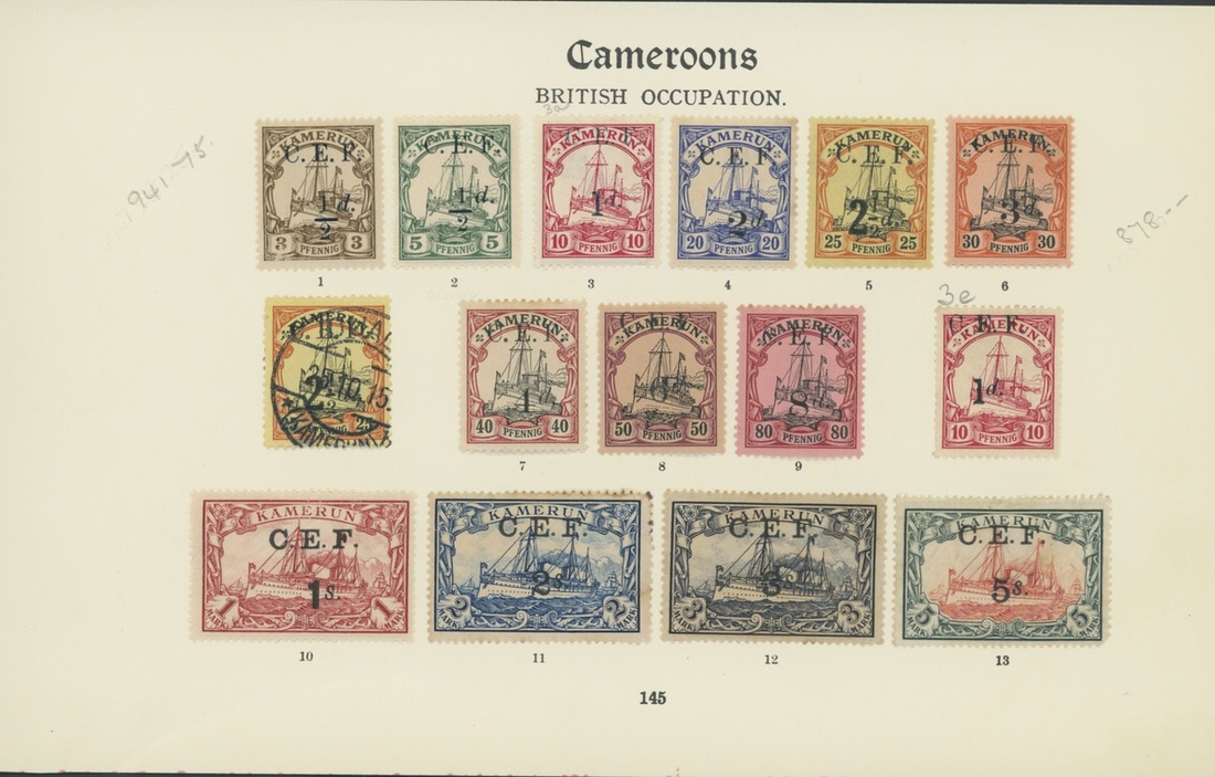 1915 set of thirteen mint hinged to pre-printed page; also 1d. on 10pf. surcharge in black and 2½d. on 25pf. used. S.G. B1-B13, £965