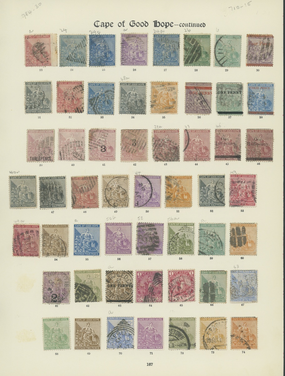 1853-1904 used selection on pages including a range of Triangulars in mixed condition (19) with 1853 4d. blue, 1d. brown-red, 1/- bright green and 1/- deep dark-green and 1861 4d. milky-blue, and Rectangulars 1864-77 and 1871-76 issues and 1902-04 set