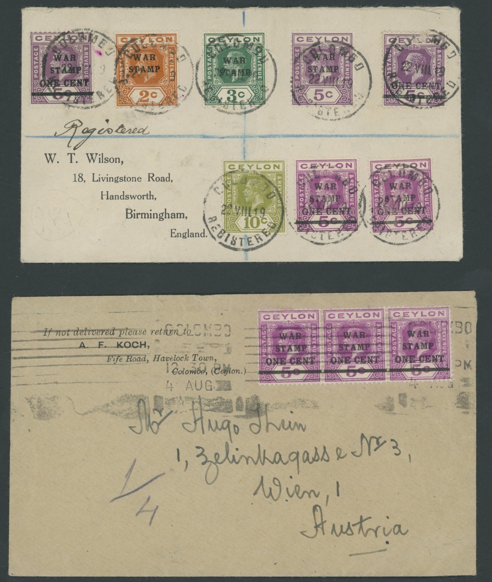 1919 Wilson envelope registered from Colombo to England bearing War Stamps (7 covering all values) and 10c. neatly cancelled, and undated envelope from Colombo to Austria bearing 1918 War Stamp 1c. on 5c. strip of three, a nice commercial franking