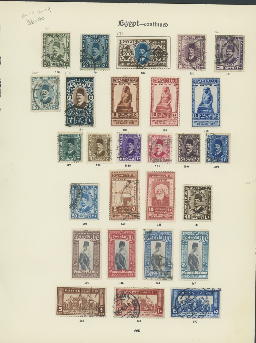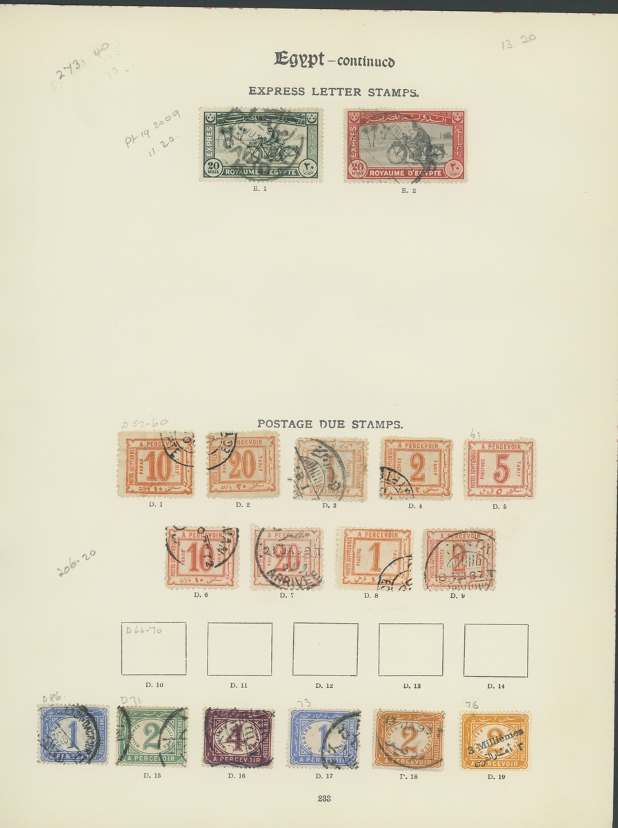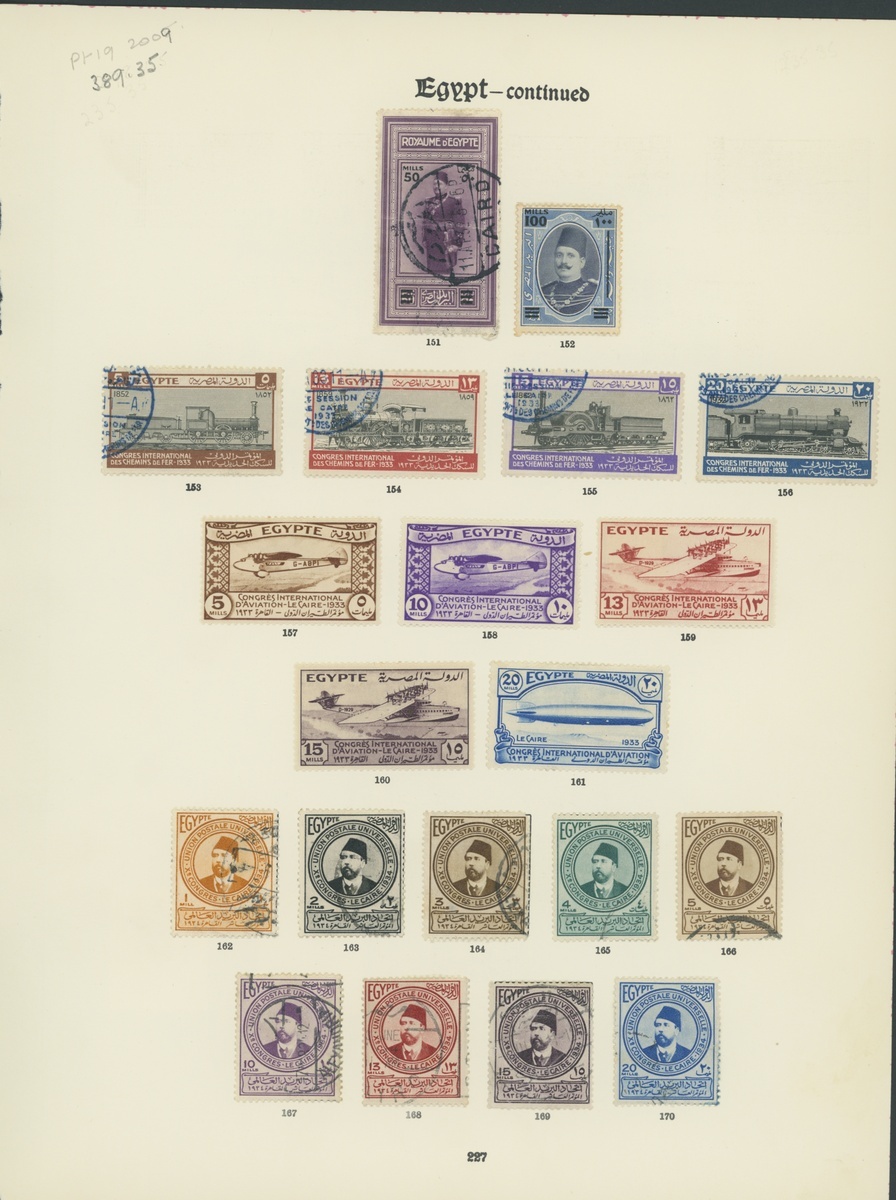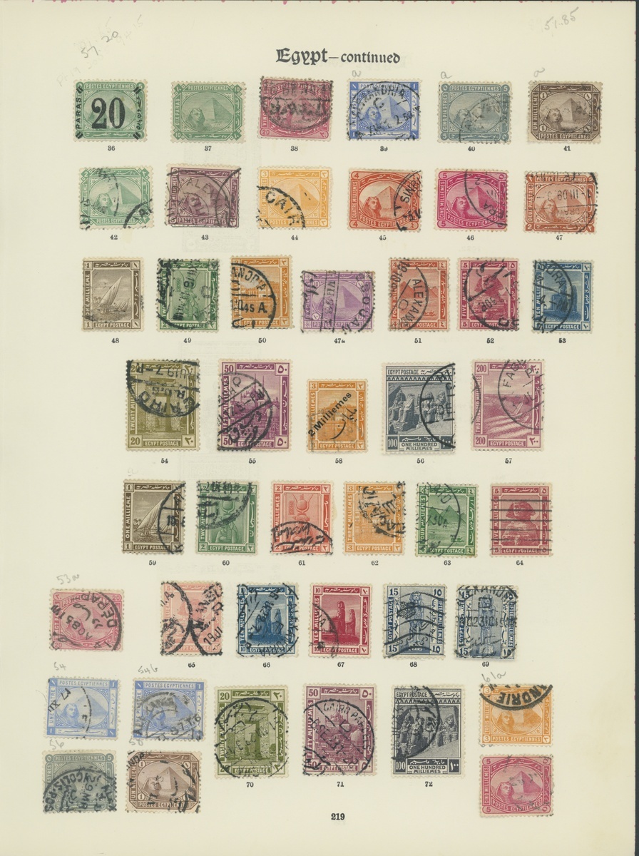 1866-1935 mainly used selection on pre-printed pages including a range of early issues with 1866 5pi. rose unused, 1867-71 5pi. brown, 1932 100m. on £1 unused (toned), 1933 Aviation Congress set mint, 1935 Silver Jubilee used, 1932-35 Xmas Seals, Air Stamps, Postage Dues etc.