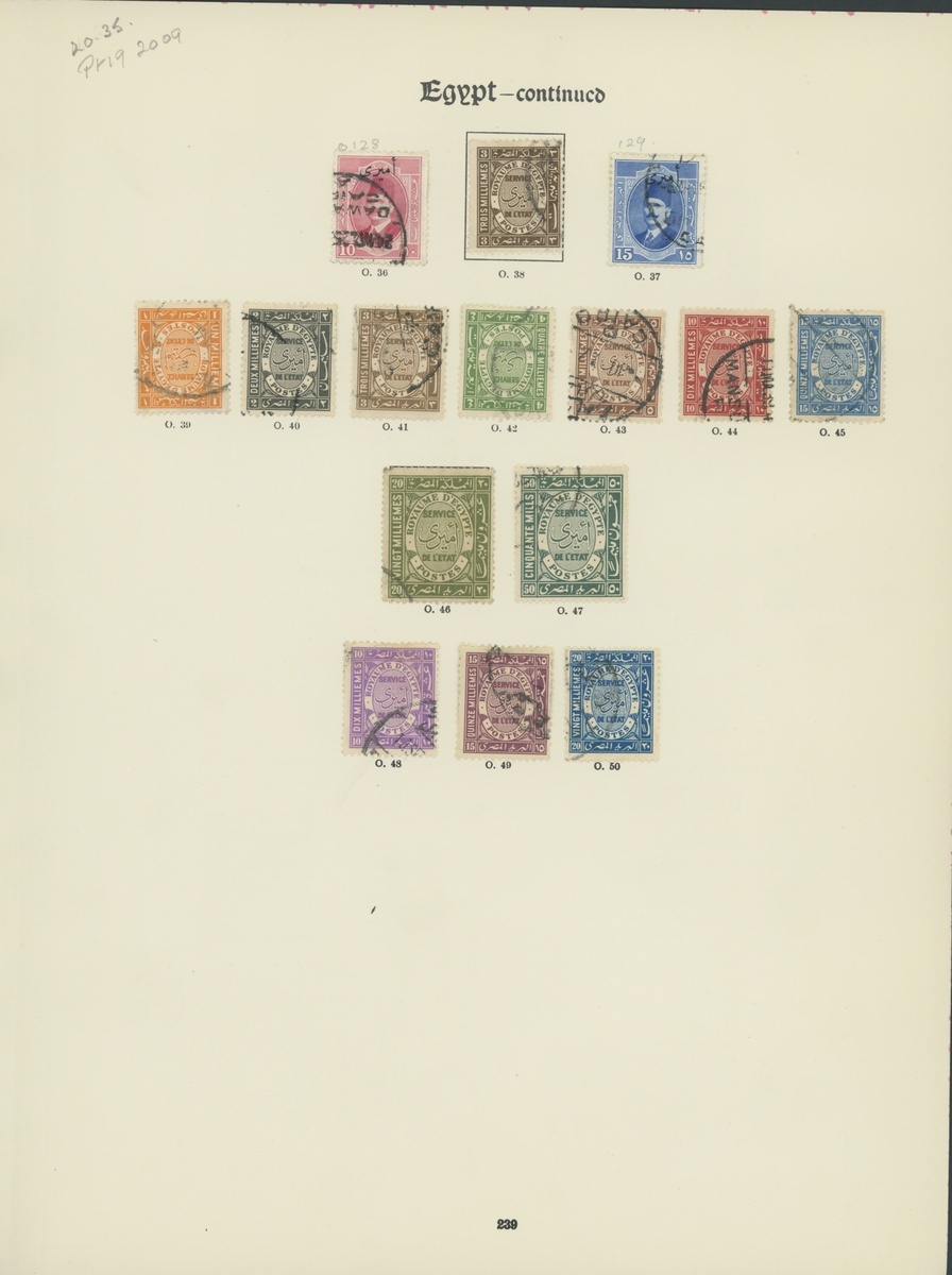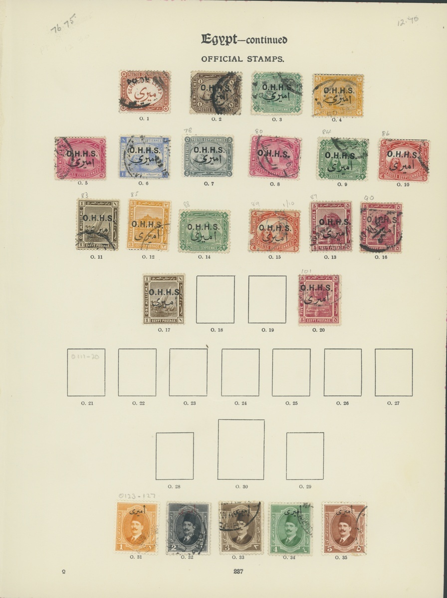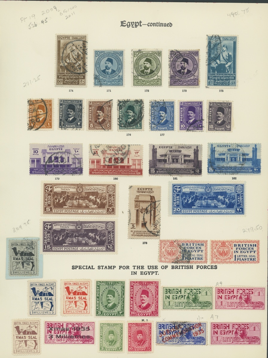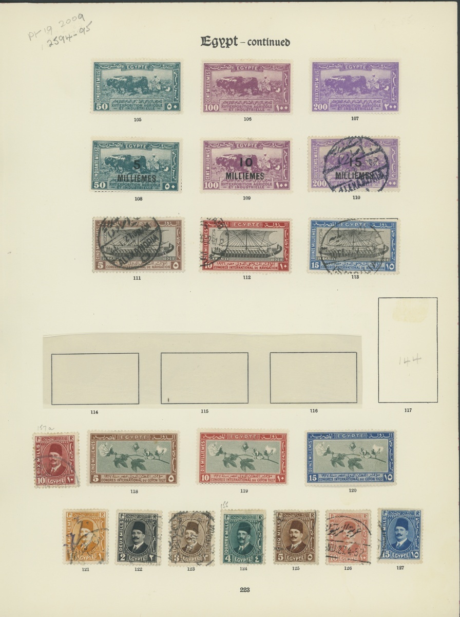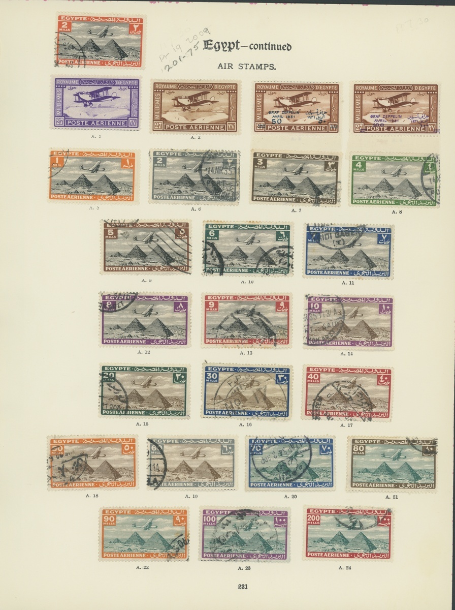 1866-1935 mainly used selection on pre-printed pages including a range of early issues with 1866 5pi. rose unused, 1867-71 5pi. brown, 1932 100m. on £1 unused (toned), 1933 Aviation Congress set mint, 1935 Silver Jubilee used, 1932-35 Xmas Seals, Air Stamps, Postage Dues etc.