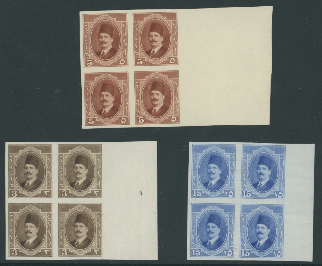 1923-24 Harrison 3m. brown, 5m. chestnut, imperforate blocks of four, and 15m. blue imperforate essay block of four, unmounted mint; fine. S.G. 113a, 115a, etc.