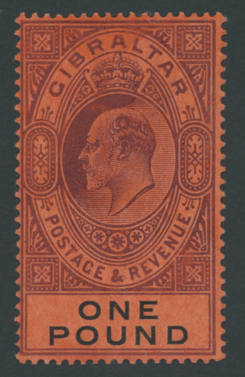 1904-08 MCA £1 deep purple and black on red, large part original gum. S.G. 64, £650