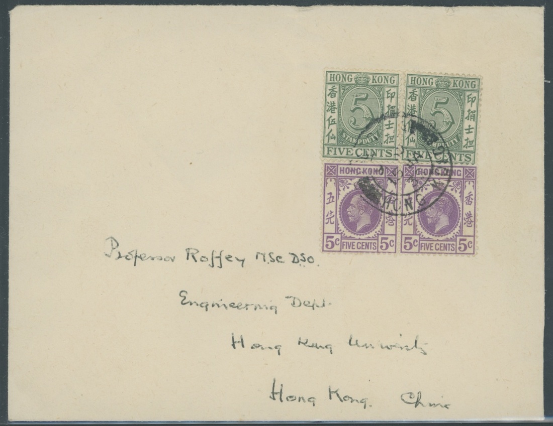 1938 5c.green pair used in conjunction with KGV 5c. violet vertical pair, cancelled by Hong Kong c.d.s. on 1938 (15 Jan.) envelope addressed locally