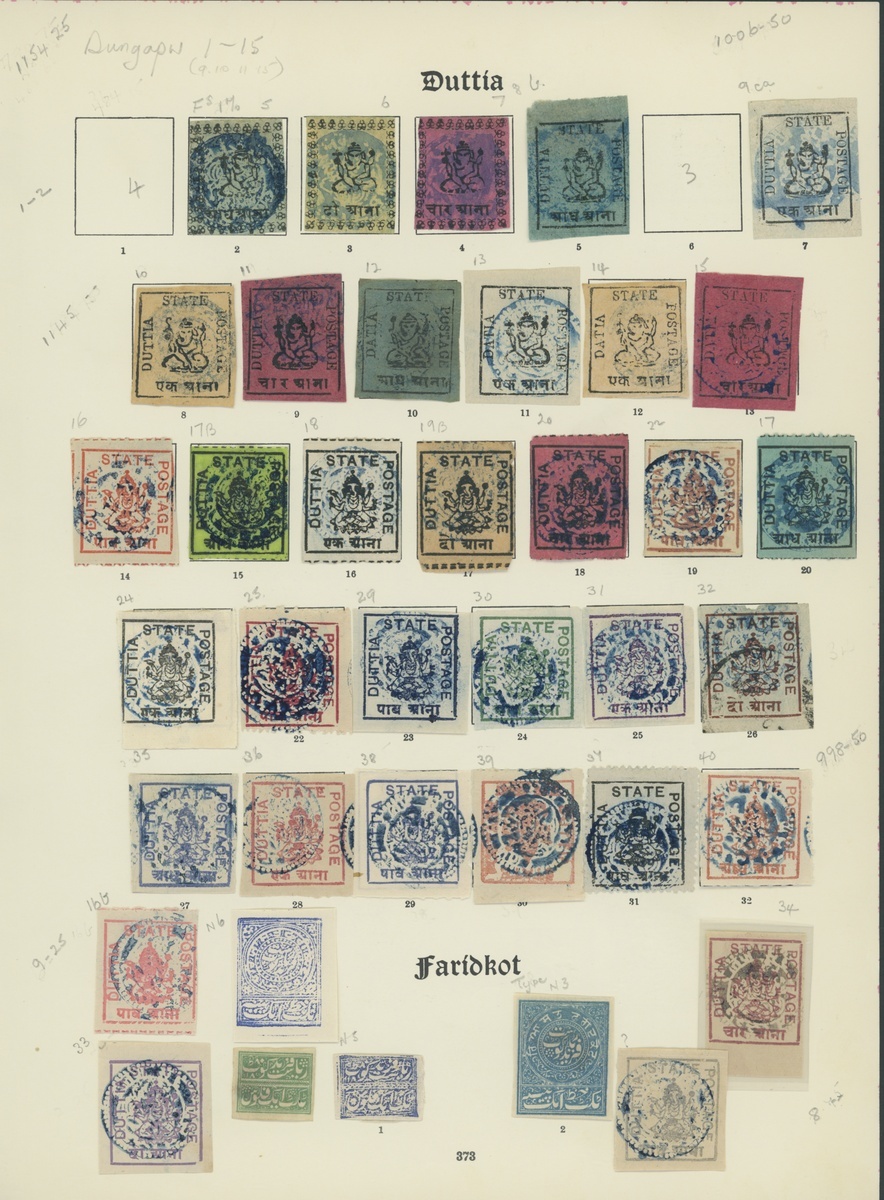 1897-1920 selection on pre-printed page including 1897 set of four, 1899-1906 set to 4a., 1916 4a. venetian red, also a few Faridkot issues (4) etc.