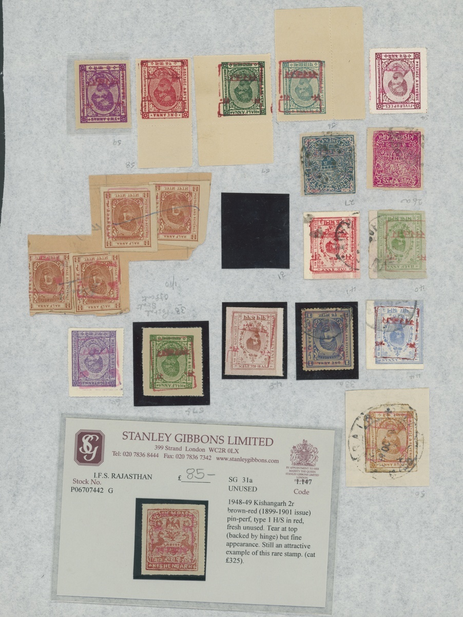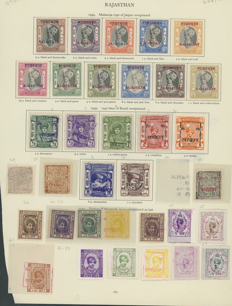 1948-50 selection on pre-printed pages including 1948-49 Bundi handstamped issues with values to 1r., 1950 Jaipur set overprinted to 1r., 1899-1901 Kishangarh handstamped issues 4a. chocolate and 2r. brown-red, 1904-10 8a. grey etc.