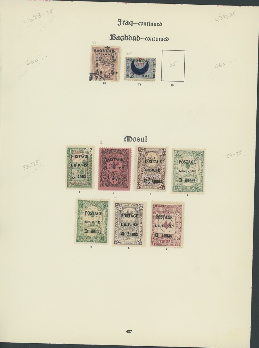 1917-1919 mainly mint on pre-printed pages with 2a. on 1pi. ultramarine and 1a. on 20pa. rose etc; some assumed forgeries, also 1919 Mosul set of seven mint