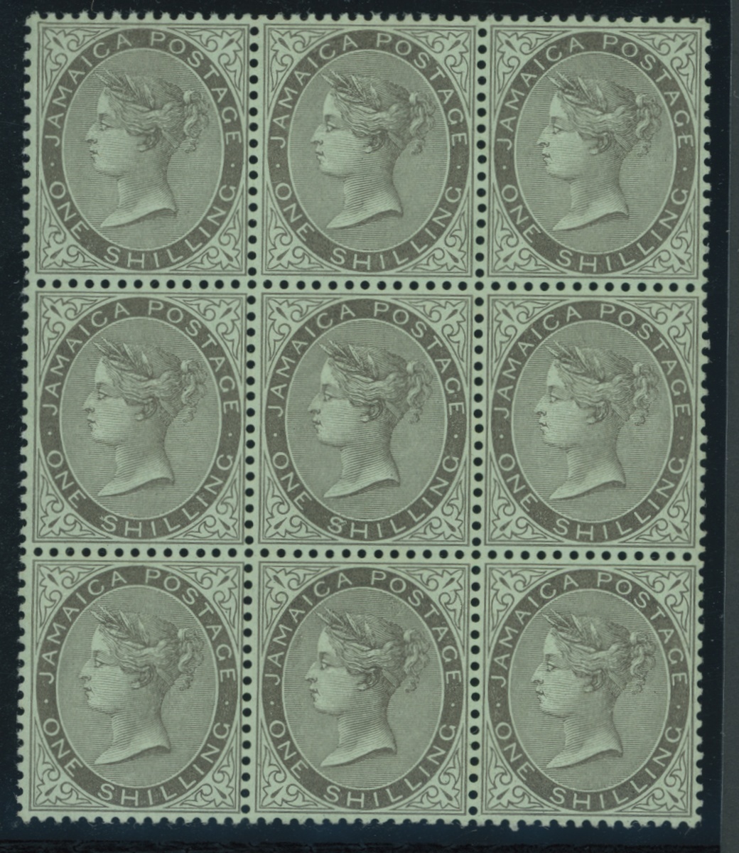 1905-11 1/- black and green block of nine, the centre stamp Row 2/2 variety