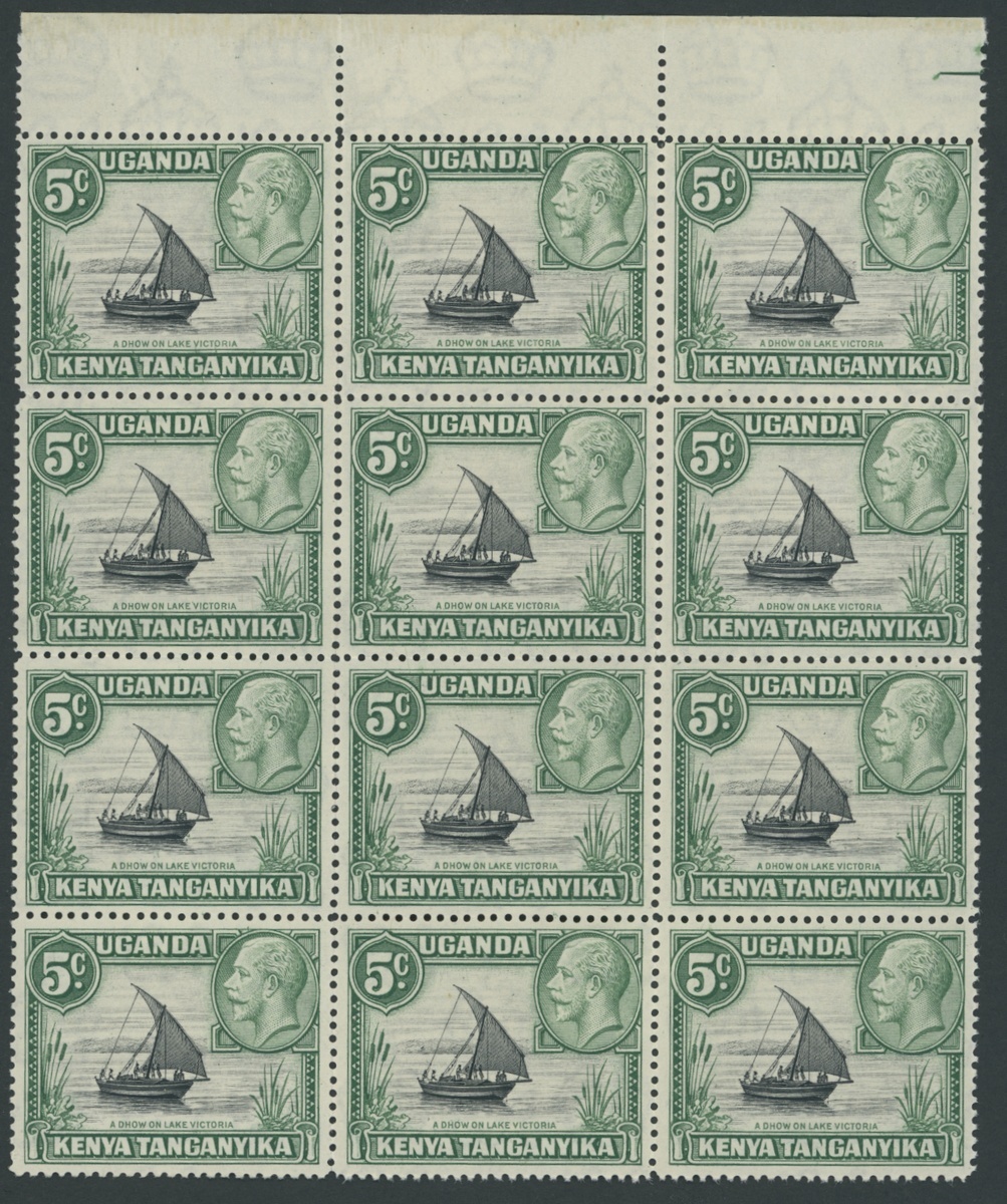 1935-37 5c. black and green block of twelve with margin at top, showing rope joined to sail, unmounted mint. S.G. 111a, £480