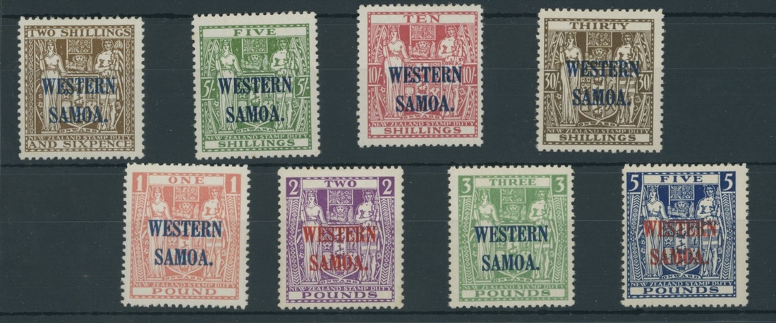 1945-53 Postal Fiscal 2/6d. to £5 set of eight, large part original gum; some toning. S.G. 207-214, £1,300+