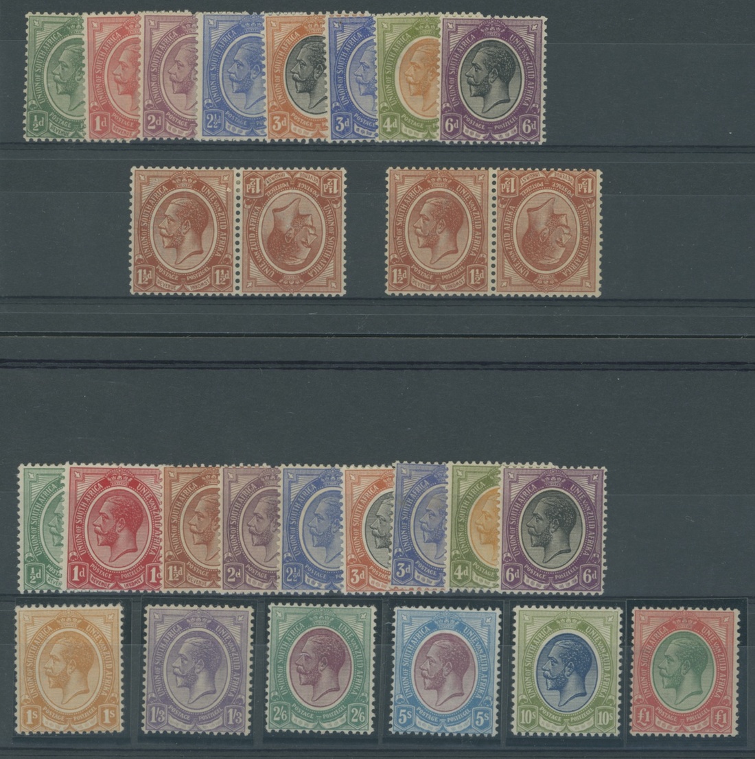 1913-24 ½d. to £1 set of fifteen with additional ½d. to 6d. (no 1½d.) and 1½d. tête-bêche pairs (2); 10/- with light bend at right otherwise generally fine mint. S.G. 3-17, £990