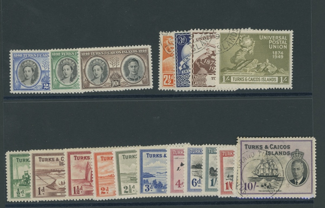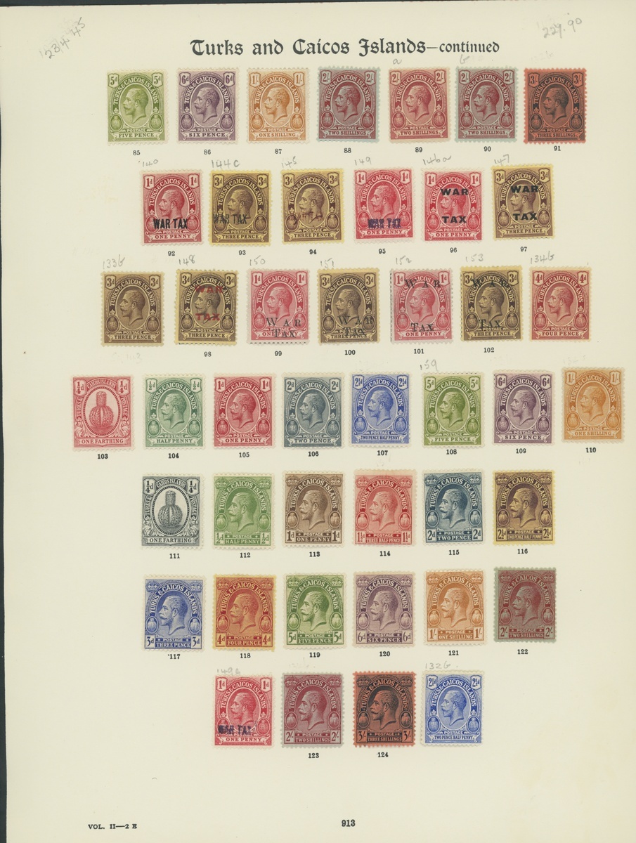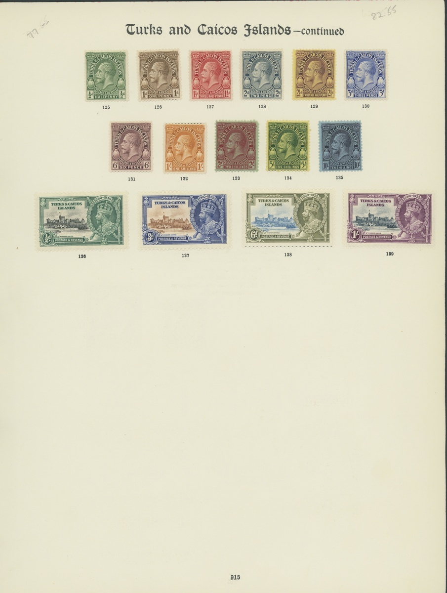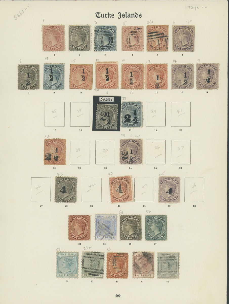 1867-1950 mint and used on pre-printed pages including Turks Islands 1873-79 1/- lilac used, 1881 Type 16 overprint 2½d. on 6d. black with R.P.S. Certificate (1960), Type 19 2½d. on 1/- lilac signed Richter, and Turks and Caicos Islands 1909-11 set to 3/- mint, 1928 set to 10/- mint, 1938-45 set of fourteen mint etc.