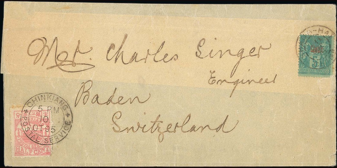 French Post Office: 1895 (10 Oct.) newspaper wrapper to Singer in Baden,  Switzerland bearing ½c. rose tied by a fine strike of the 29mm "