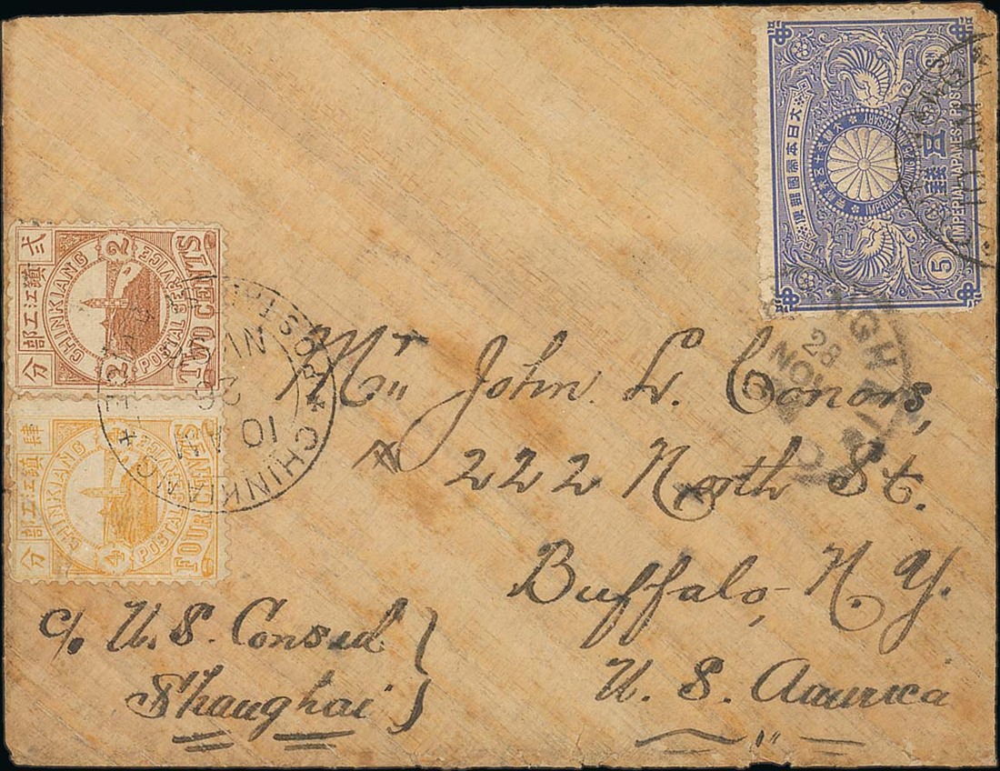 Japanese Post Office: 1896 (26 Nov.) envelope made of wood to U.S.A.  "c/o U.S. Consul, Shanghai" bearing first issue 2c. and 4c. tied by the 29mm double-circle "