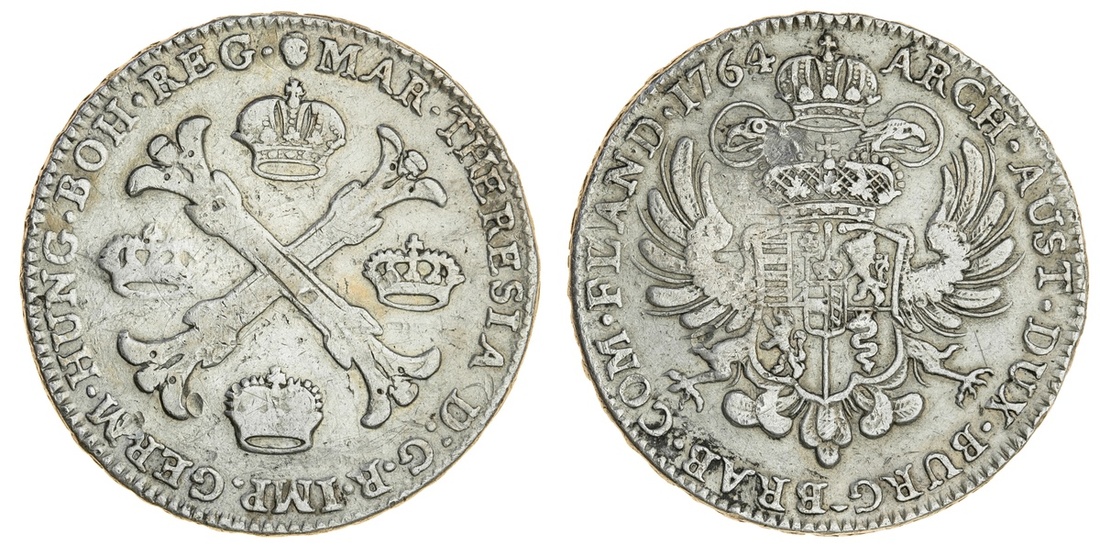 (x) Austrian Netherlands, Maria Theresa (1740-80), Kronentaler, 1764, Brussels, crossed staves, rev. crowned shield on double-headed eagle (Dav.1282), very fine