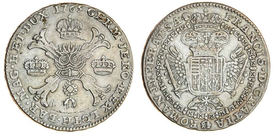 (x) Austrian Netherlands, Francis I (1745-65), Kronentaler, 1765, Brussels, crowned shield on double-headed eagle, rev. crossed staves (Dav.1283), very fine