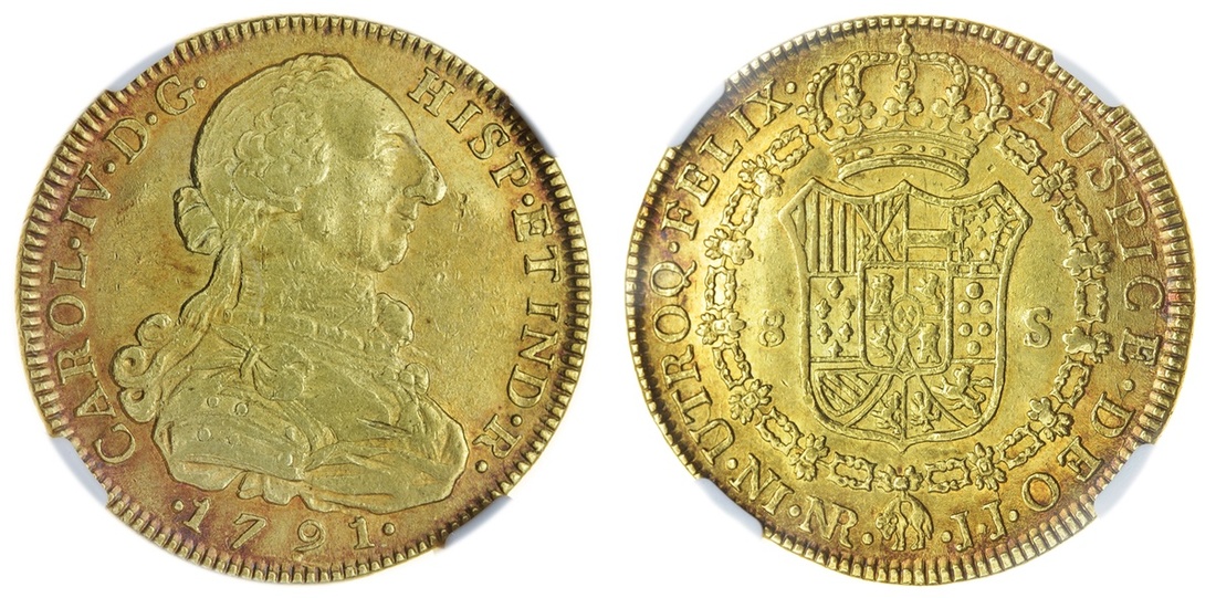 (x) Colombia, Charles IV (1788-1808), gold 8-Escudos, 1791-JJ, Nuevo Reino, reads
