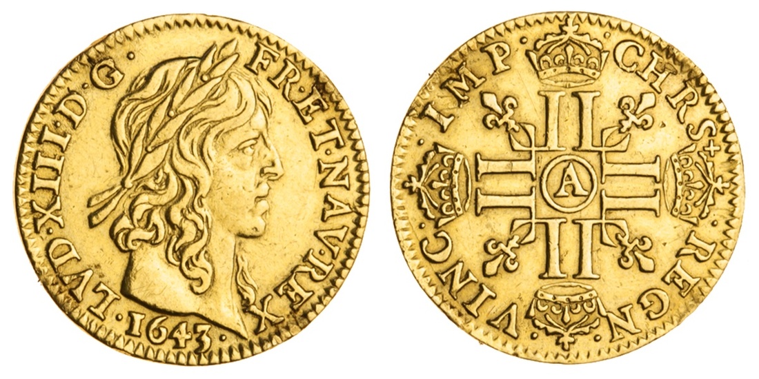 France, Louis XIII (1610-43), Louis d'or à la meche longue, 1643, Paris, laureate head right, rev eight Ls cruciform (Dup.1299; F.411; Gad.57), from a mount, very fine