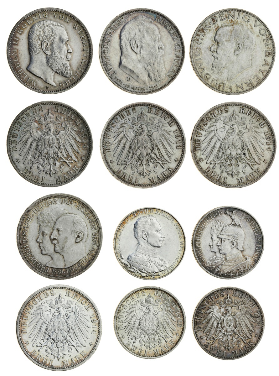 Germany, States, silver coins (6), Anhalt, 3-Marks, 1914; also, Bavaria, 3-Marks (2), 1911 D, 1914; Prussia, 2-Marks (2), 1901, 1913, and Wüerttemberg, 3-Marks, 1914 F, very fine to extremely fine (6)