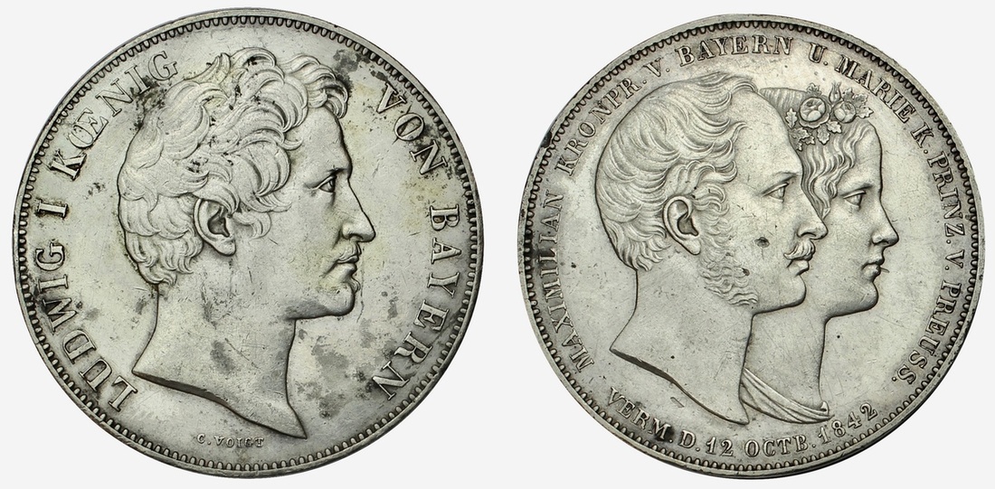 Germany, Bavaria, Ludwig I (1825-48), Marriage Double Thaler, 1842, Munich, Commemorating the Marriage of the Crown Prince (Jaeger 72; Dav. 588), stained and with hairlines on obverse, otherwise quite brilliant surfaces, good very fine