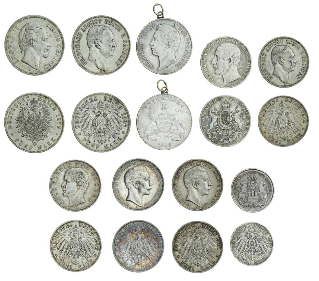Germany, States, silver coins (9), Bavaria, 5-Marks, 1875 D, 3-Marks, 1908 D; also, Hamburg, 2-Marks, 1903; Hannover, Taler, 1861; Prussia, 3-Marks (2), 1908 A, 1911 A; Saxony, 5-Marks, 1907 E, 3-Marks, 1910 E, and Württemberg, 2-Gulden 1849, this mounted, mixed condition, average fine to to very fine (9)