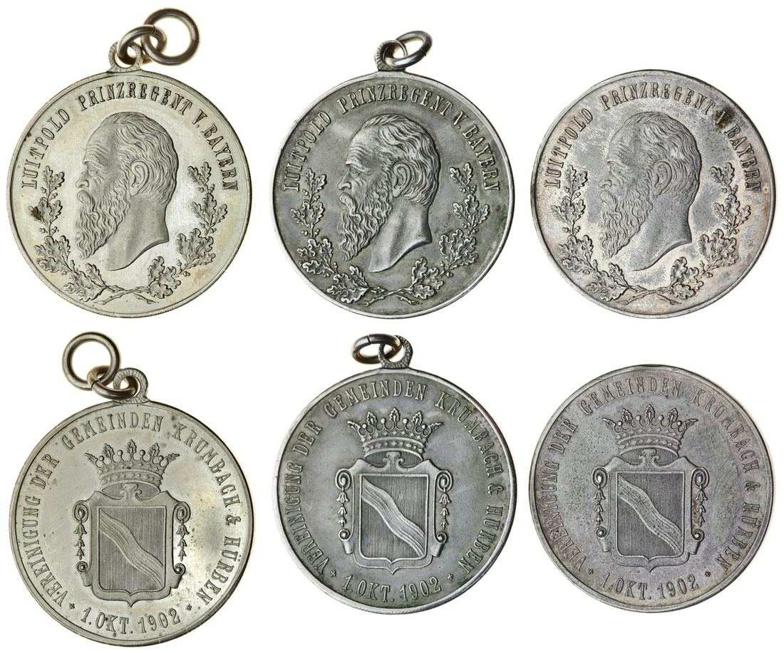 Germany, Bavaria, Luitpold, as Prince Regent (1886-1912), CuNi Medals, 1 October 1902, Upon the Unification of Krumbach and Hürden, 32 mm (3), very fine to extremely fine, with integral suspension eyes for wear on ladies' dresses during festivals (3)
