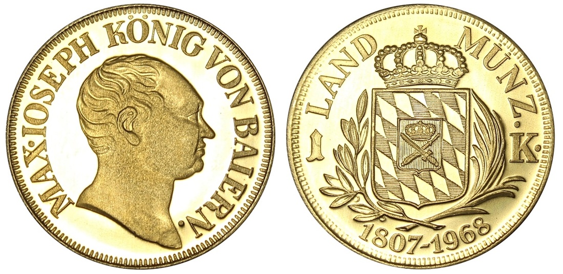 Germany, Bavaria, Maximilian Joseph (1806-25), 'On the 50th Anniversary of the Free State', gold Medallic Kreuzer, 1968, 3.45g, 20mm., in the style of the founder of the Kingdom 1807-1968 (cf. Münzenhandlung Harald Möller, auction 63, lot 282), brilliant uncirculated, in original Muenzen und Medaillen, Muenchen plastic wallet