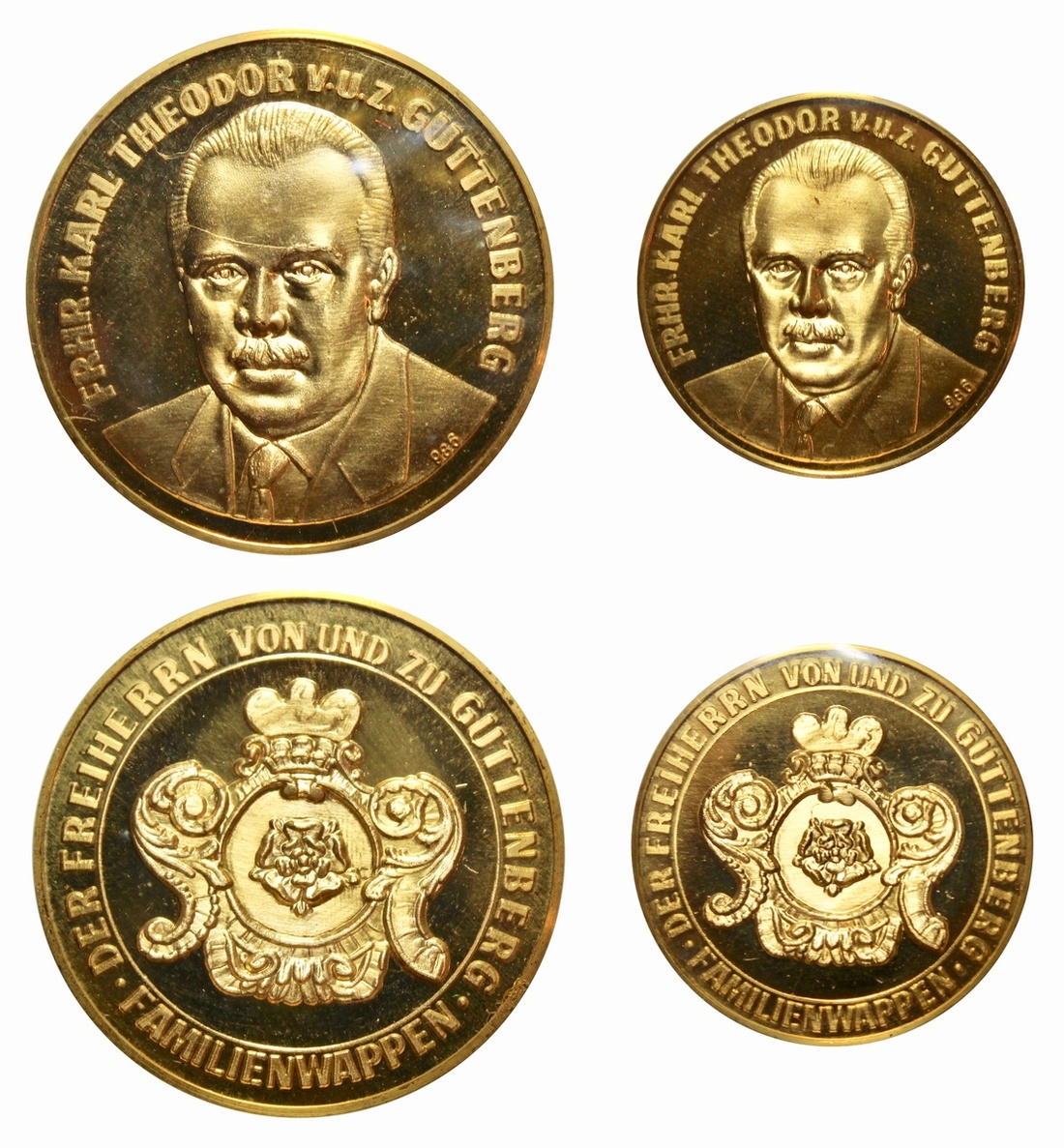 Germany, Federal Republic (Bavaria), Karl Theodor Freiherr von und zu Guttenberg (1921-72), gold Medals, struck .999 fine, 9.37g including packaging; another, 3.80g, including packaging, portrait three-quarter facing, rev. family crest, brilliant uncirculated, sealed in vacupacks of issue (2)
