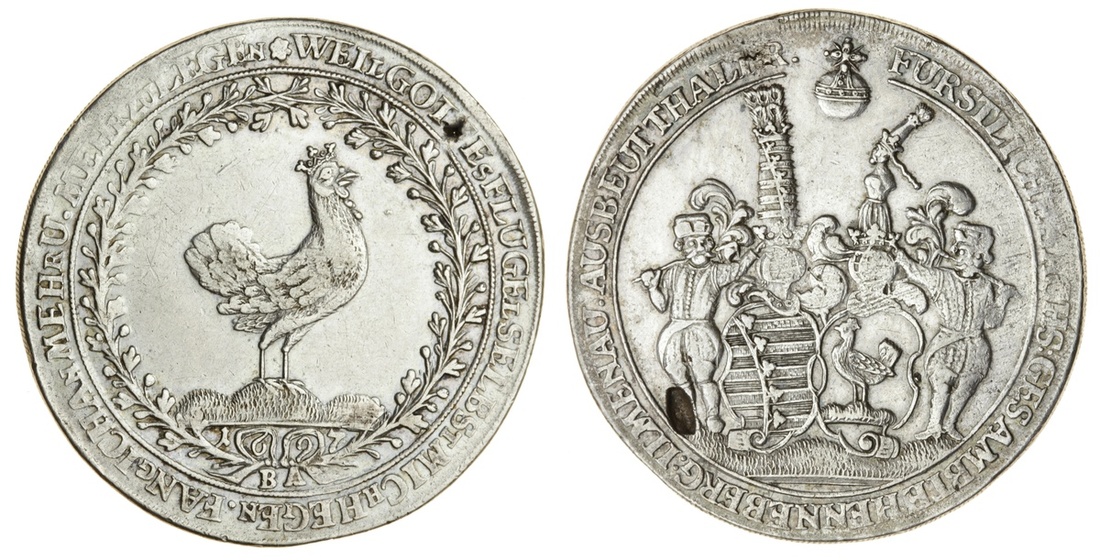 (x) Germany, Henneberg, Reichsaler, 1697, Ilmenau, two shield with helms and supporters rev. hen in wreath, date and
