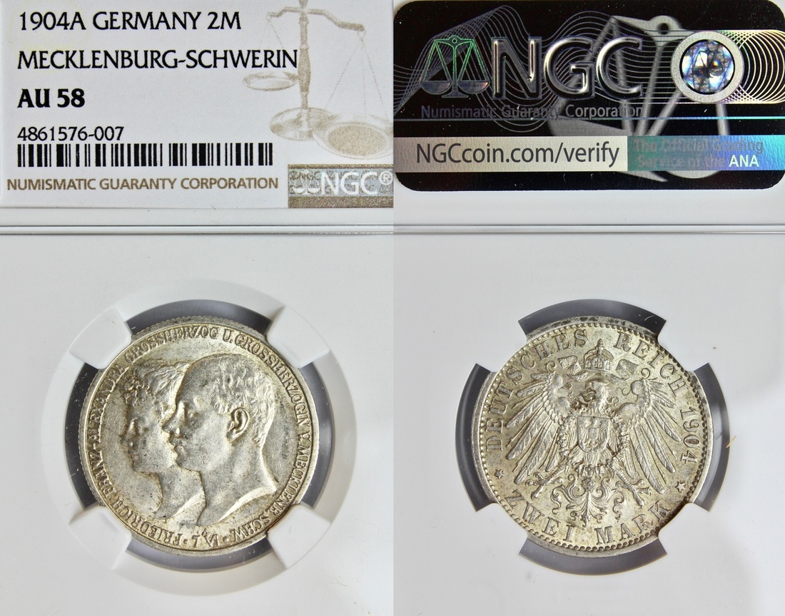 Germany, Mecklenburg-Schwerin, Friedrich Franz IV (1897-1918), 2-Mark, 1904 A, Clausthal, Commemorating the Royal Wedding (AKS 61; Jaeger 86; KM 333), light tone overlying lustrous surfaces, extremely fine, in NGC holder, graded AU58 (Cert.# 4861576-007)