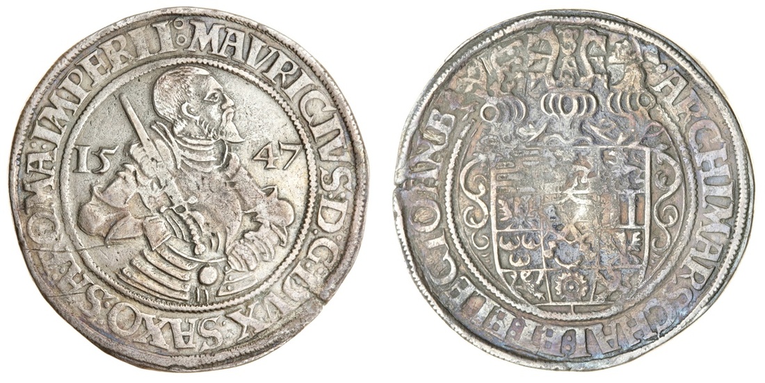 (x) Germany, Saxony, Albertine line, Moritz (1541-53), Taler, 1547, Annaberg, armoured half-length right, with sword, dividing date, rev. shield with three helms (Dav.9786), a small scratch on the obverse and black deposit partially removed from the reverse, otherwise about very fine