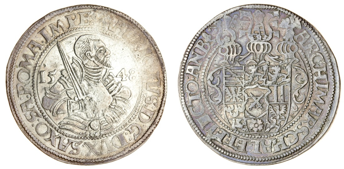 (x) Germany, Saxony, Albertine line, Moritz (1541-53), Taler, 1548, Annaberg, armoured half-length right, with sword, dividing date, rev. shield with three helms (Dav.9786), very fine